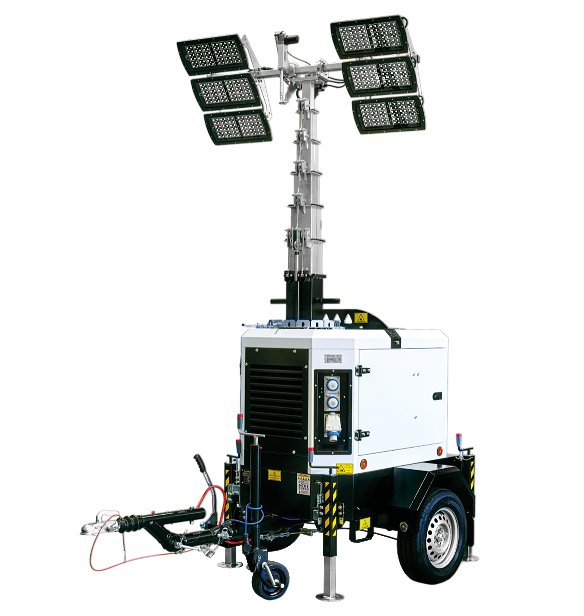 A torony vontatható utánfutóra van szerelve, könnyen szállítható.