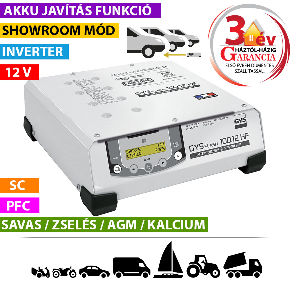 GYSFLASH 100.12 HF inverteres akkumulátor töltő (5 m kábel)