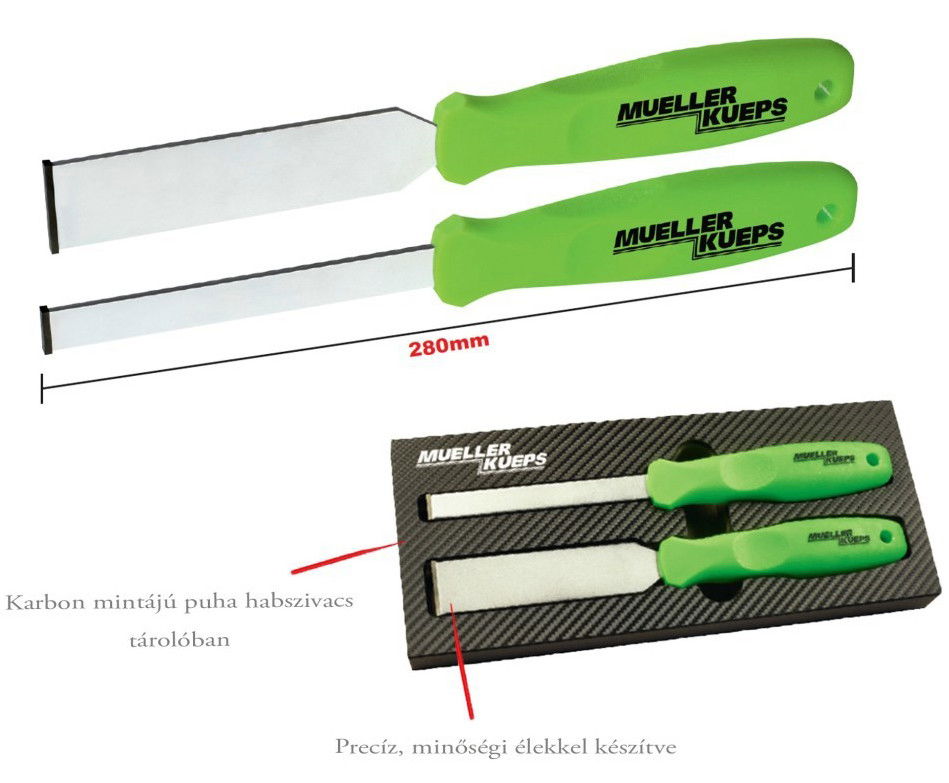 - Két részes készlet, melyben egy keskenyebb és egy szélesebb tömítés kaparó található.